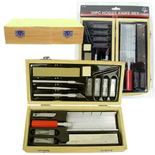 This may be the last hobby cutting set you need to buy - this set is packed full of goodies from a razor sharp steel saw and miter box to surgical-steel blades with different sized handles, this set has you covered.Features: Mini miter-box and fine-tooth stainless steel saw for easy angle cuts Small, medium and large knife handles with firm-grip blade collets 30 razor-sharp surgical-steel blades in six different styles and sizes Awl-pick handle Tweezer and sanding block All in custom-fit wooden storage box
