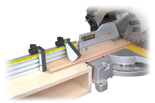 Our 4507 Pro Kit will make your chop saw a better tool. The Ultra Track forms the fence and is a full 3/4 thick by 3" high. Our Curved Stop attaches to the top of the Ultra Track fence and flips up when not needed or lifts out of the way when a board up to 7/8" thick is pushed under it. Two 96" Ultra Track fences mount to a table (you supply) on either side of the chop saw, flush with your chop saws fence. Includes two 48" Ultra Tracks, brackets for mounting the Ultra Track to your table, two 96" Measuring Tapes, Curved Stop, Straight Stop and Stop Extension Arm.